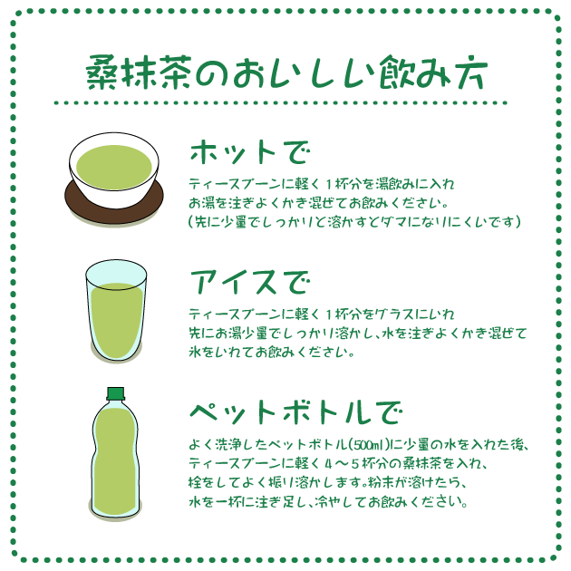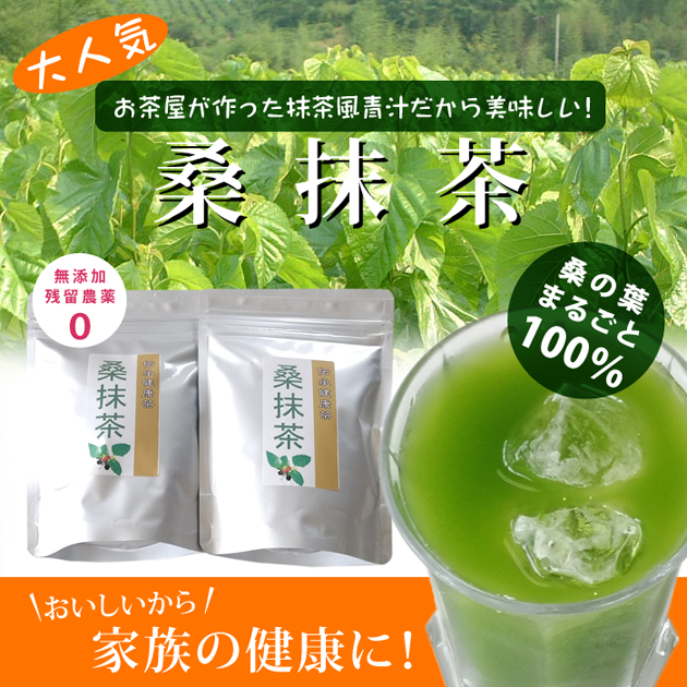 伝承健康茶 桑抹茶 1,080円[税込](100g入) その昔、日本に茶をもたらした栄西禅師の記した書物「喫茶養生記」には、茶の薬効とともに桑の薬効についても説かれていました。桑と茶は古くから関係の深いものだったのです。食べ物の糖分や脂肪、生活習慣が気になる方におすすめです。