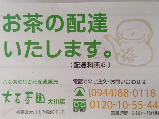 お電話一本で、お茶の宅配もいたします。大川市、柳川市、城島町、大木町、佐賀市諸富町・川副町、千代田町など。お気軽にお申し付けください。